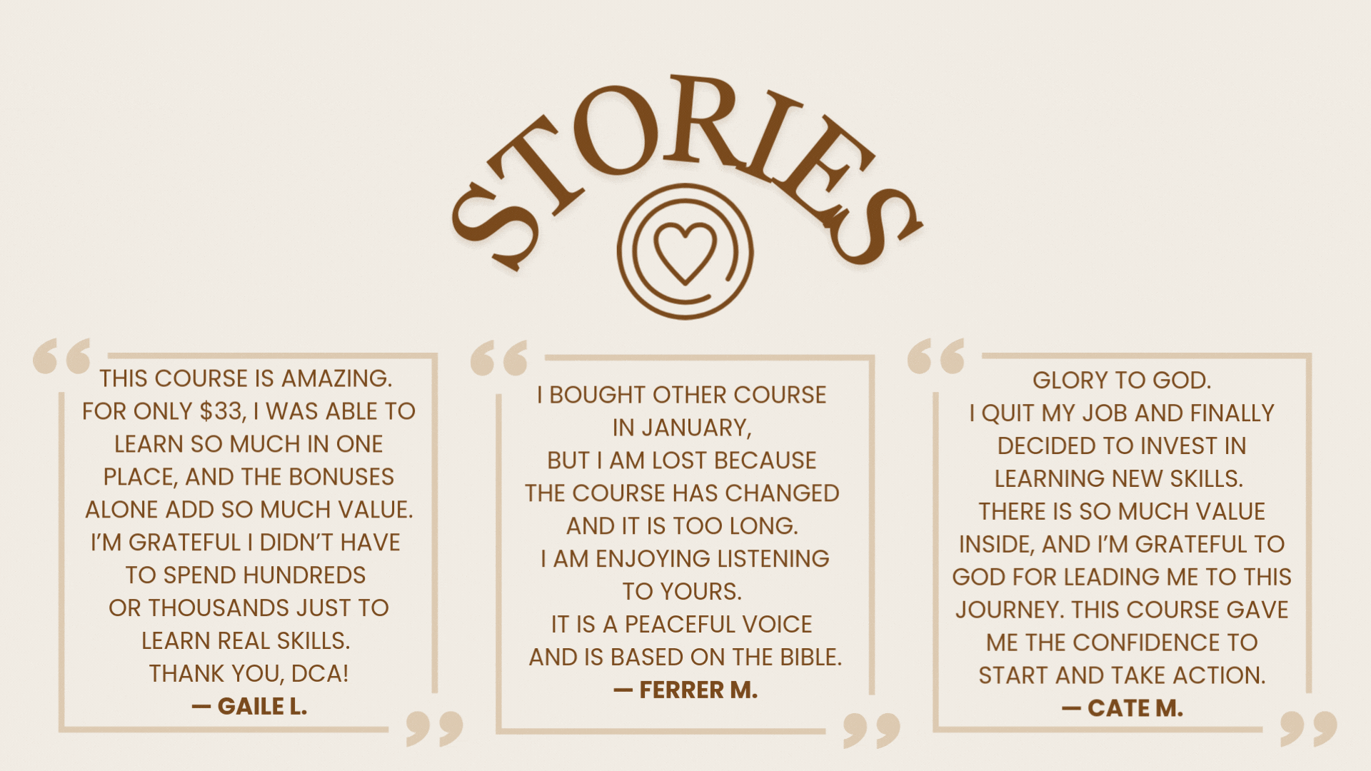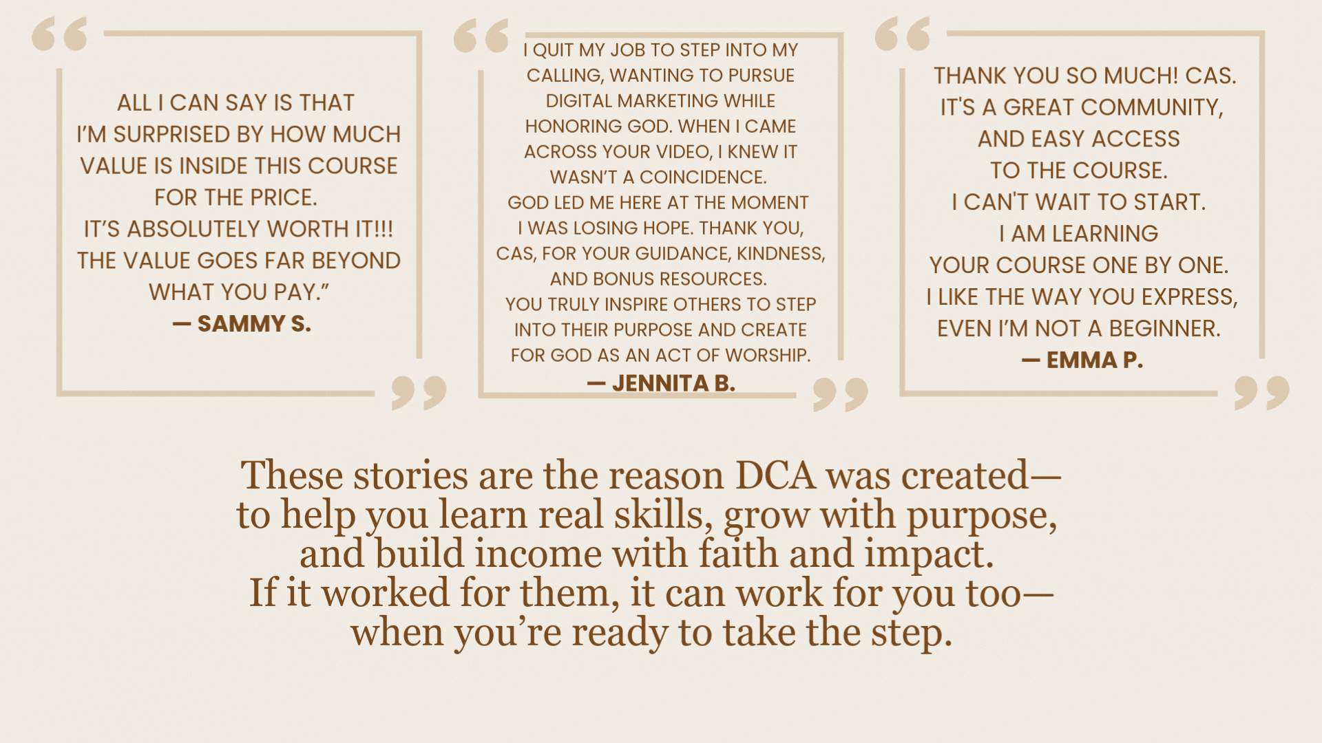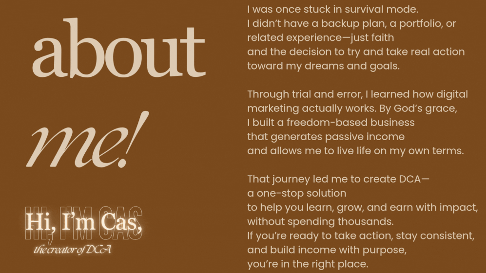 With step-by-step training, done-for-you resources, and essential tools, DCA helps you start and scale your online business with clarity. Plus, you can earn up to 70% commission by reselling the course.
